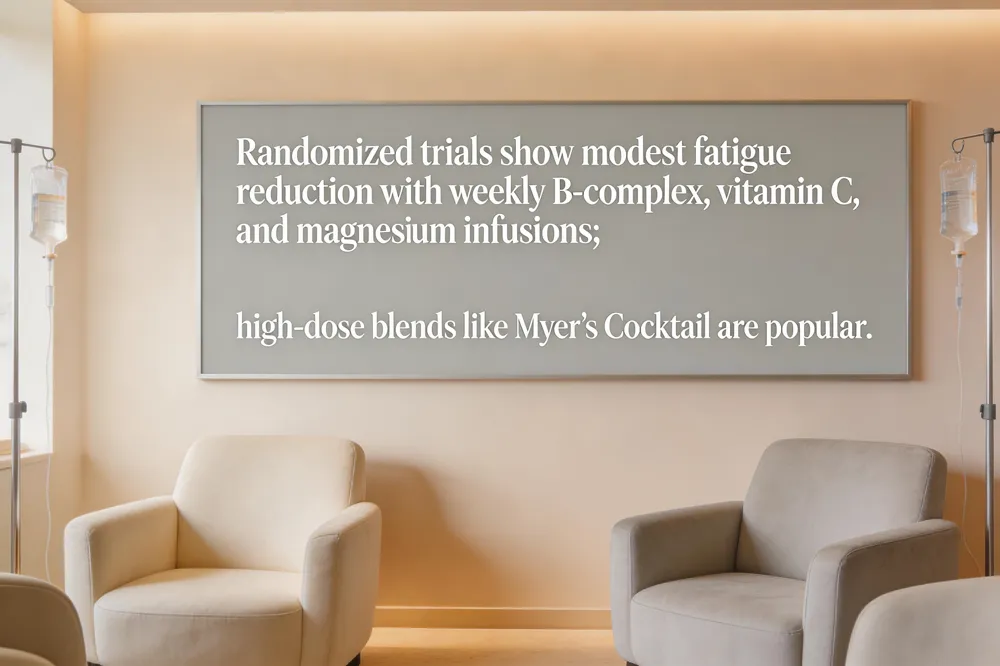Randomized trials in chronic fatigue syndrome show modest but statistically significant fatigue reductions with weekly B‑complex and vitamin C infusions, often plus magnesium. Randomized trials in chronic fatigue syndrome show modest but statistically significant fatigue reductions with weekly B‑complex and vitamin C infusions, often plus magnesium.