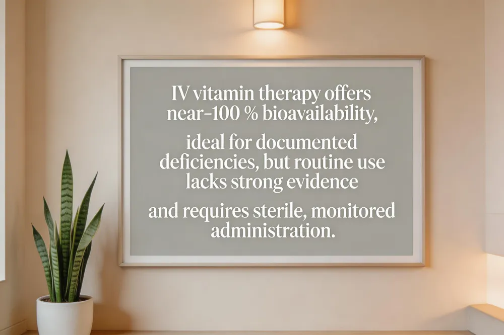 IV vitamin therapy provides near‑100 % bioavailability because nutrients are delivered straight into the bloodstream, bypassing the gastrointestinal tract. This makes it valuable for patients with documented deficiencies, malabsorption syndromes (e.g., Crohn’s disease, post‑bariatric surgery), or acute medical needs such as severe thiamine deficiency. Current guidelines from major health agencies do not endorse routine IV vitamin use for general wellness; instead, clinicians reserve it for documented deficiencies or specific clinical indications and follow strict sterile protocols, individualized dosing, and continuous vital‑sign monitoring. The therapy can quickly replenish B‑complex vitamins, vitamin C, magnesium, and glutathione, which may boost energy, reduce fatigue, and support antioxidant defenses, especially when oral absorption is impaired. Safety is high when performed by qualified professionals using pharmacy‑grade, preservative‑free solutions, but risks—including infection, vein irritation, electrolyte imbalance, and rare allergic reactions—remain. Therefore, IV vitamin infusions should be considered only after a thorough medical evaluation and under professional supervision.