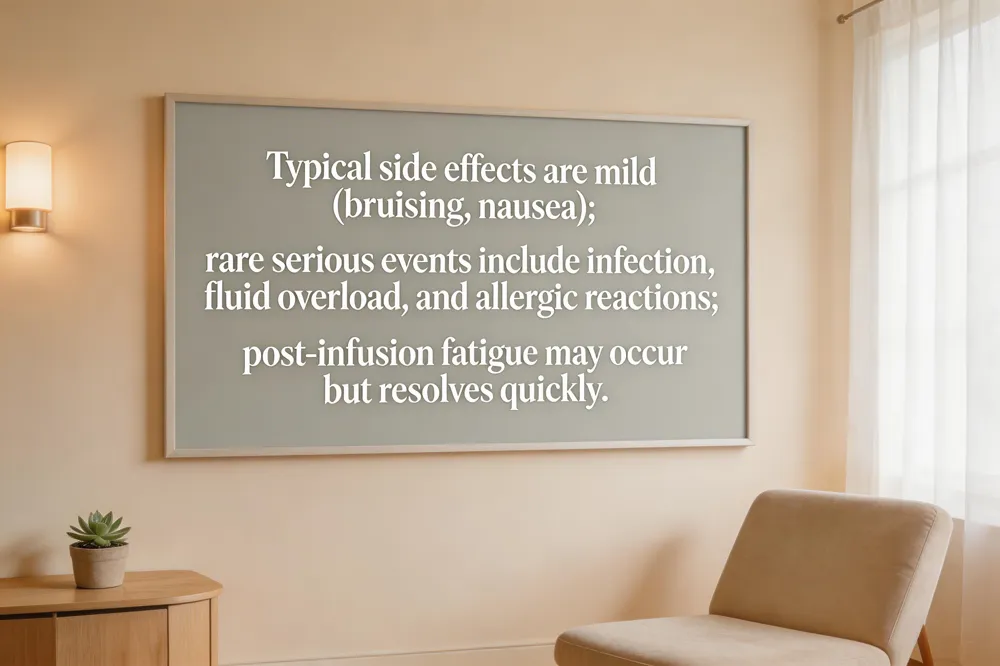 Rare but more serious risks include infection or sepsis at the insertion point, fluid overload that strains the heart or kidneys, and allergic reactions from hives to anaphylaxis. People with heart, kidney, or immune conditions must be screened; breathing difficulty, swelling, or heartbeat needs attention.