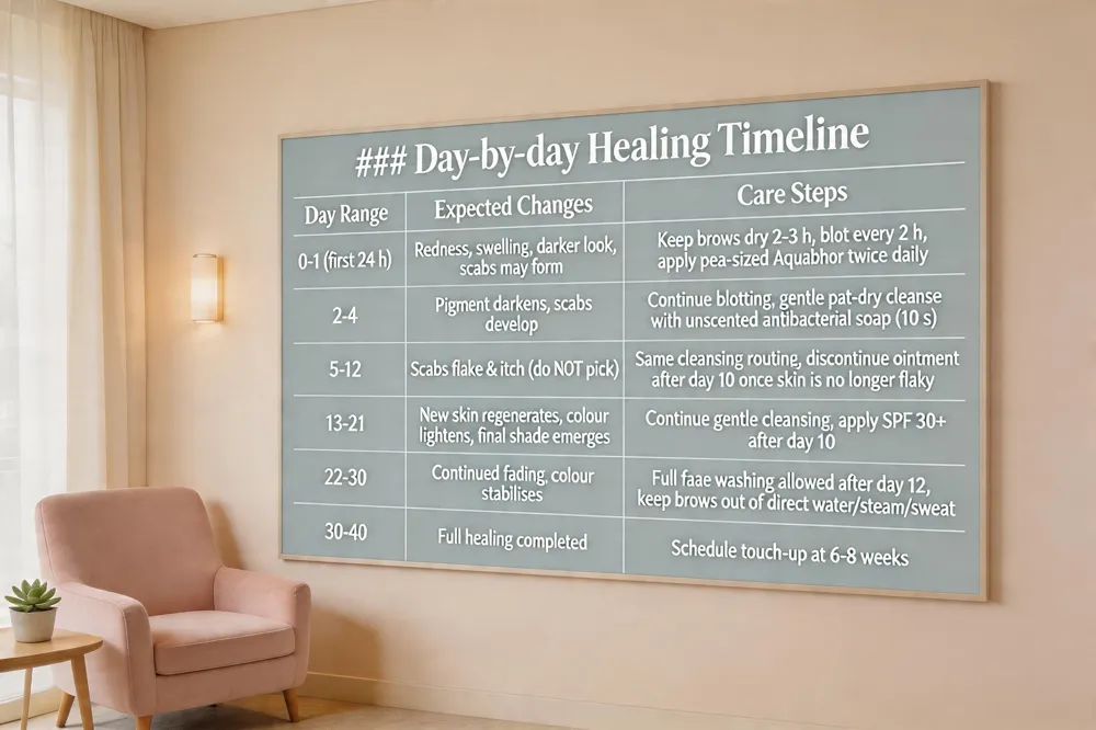 The first 24 hours bring redness, swelling and a darker look; gentle blotting every 2 hours keeps scabs from forming. Days 2‑4 see the pigment darken further as scabs develop. During days 5‑12 the scabs flake and itch—do not pick. By days 13‑21 new skin regenerates, the colour lightens and the final shade begins to emerge. Full healing is usually complete by day 30‑40, with a touch‑up scheduled at 6‑8 weeks.