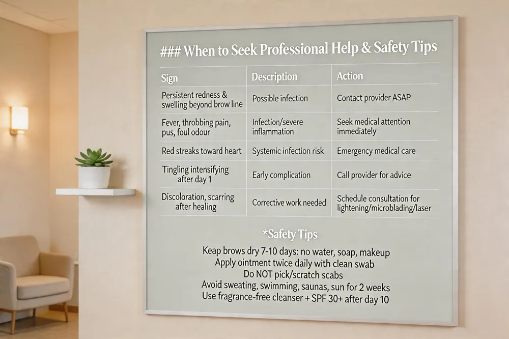 Signs of infection or complications – Watch for persistent redness that spreads beyond the brow line, increasing swelling, fever, throbbing pain, pus or foul‑smelling discharge, and red streaks heading toward the heart. Even a mild tingling that intensifies after the first few days warrants a prompt call to your provider.
