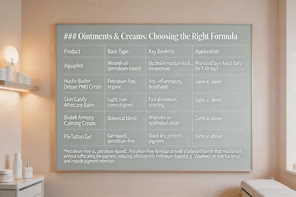 Choosing the right post‑microblading ointment is essential for soothing the skin, protecting the pigment, and preventing infection. Top recommended aftercare products include Aquaphor (a mineral‑oil base that locks in moisture), Hustle Butter Deluxe PMU Aftercare Cream (Petroleum‑free, organic, anti‑inflammatory), Skin Candy Aftercare Balm (lightweight, non‑comedogenic), Biotek Armony Calming Cream, and PhiTattoo Gel. These formulas contain humectants, vitamins, and botanical extracts that aid re‑epithelialization while allowing the skin to breathe.