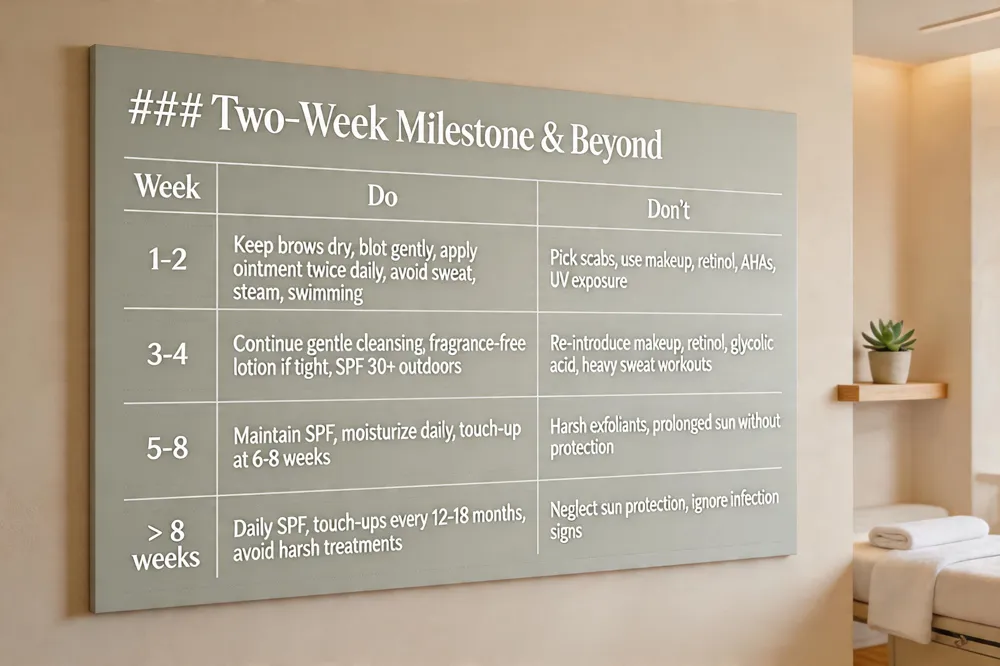 | 1‑2 | Keep brows dry, blot gently, apply ointment twice daily, avoid sweat, steam, swimming | Pick scabs, use makeup, retinol, AHAs, UV exposure |