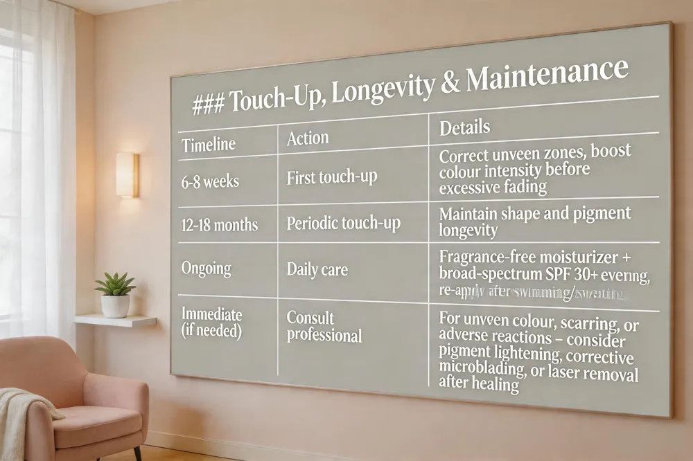 | Immediate (if needed) | Consult professional | For uneven colour, scarring, or adverse reactions – consider pigment lightening, corrective microblading, or laser removal after healing |
