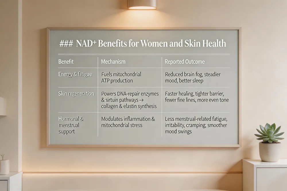 Q: NAD+ benefits for women – NAD⁺ restores cellular energy, reduces fatigue, improves mood, and enhances sleep. For skin, it boosts keratinocyte repair, leading to smoother texture, fewer fine lines, and better overall tone. It also helps alleviate menstrual‑related fatigue and mood swings, supporting mental well‑being.