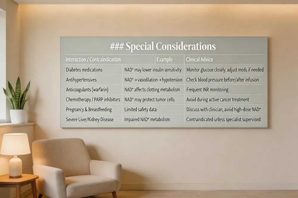 | When adding NAD+ to a wellness regimen, it’s essential to check for drug interactions, population‑specific cautions, and ways to blend the therapy with daily habits. | ||