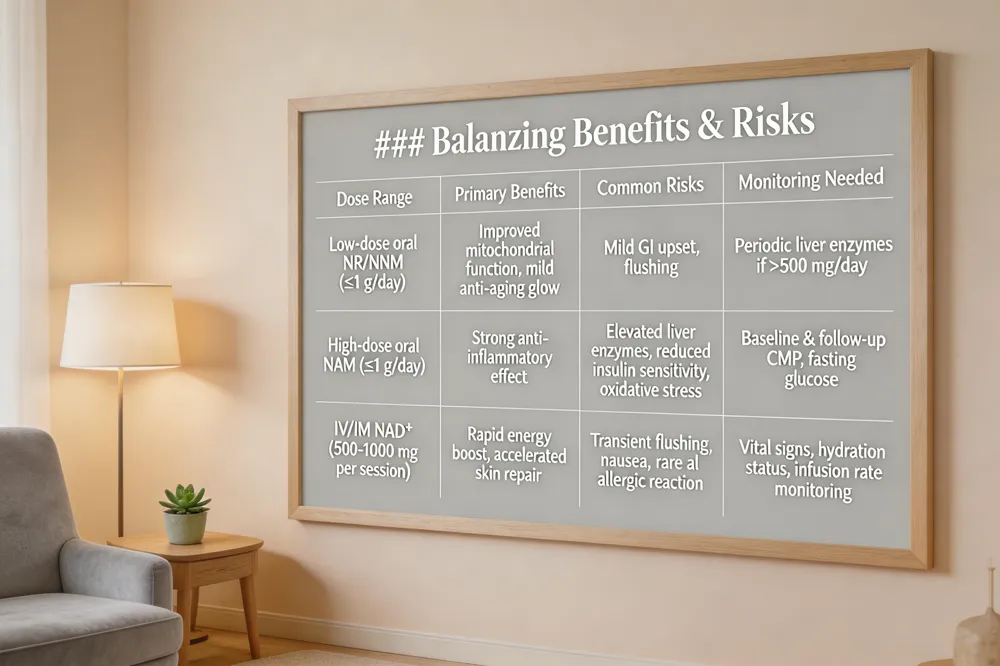 Overall risk–benefit profile Short‑term use of NR and NMN up to 1 g/day is generally well‑tolerated, with only mild nausea, flushing, headache or gastrointestinal discomfort reported. High‑dose oral NAM (≥1 g/day) may raise liver enzymes, decrease insulin sensitivity and increase oxidative stress, while very large doses (≥3 g/day) have been linked to reversible hepatotoxicity and kidney changes in animal models. IV NAD⁺ infusions produce rapid, but short‑lived side effects—flushing, nausea, light‑headedness, mild injection‑site irritation—that are usually resolved by slowing the infusion and ensuring hydration. Rare serious events include allergic reactions, phlebitis, electrolyte imbalances, or exacerbation of mood disorders, especially in patients with pre‑existing liver, kidney, cardiovascular or metabolic disease.