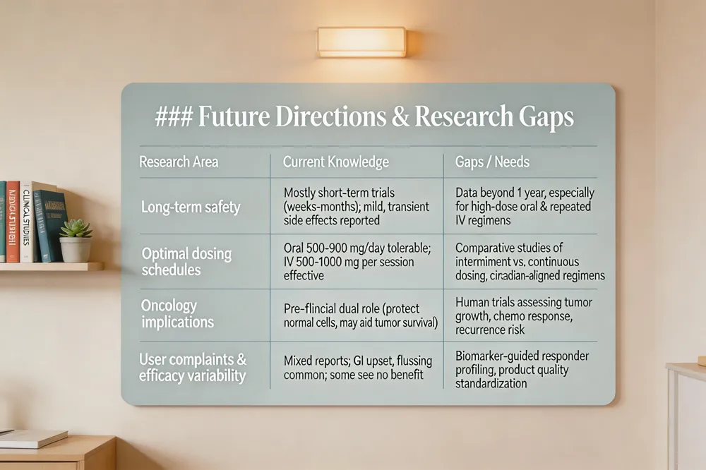 There is no consensus on the ideal dose or timing for NAD+ augmentation. Oral studies suggest tolerable upper limits of 500‑900 mg/day for nicotinamide and up to 1 g/day for NR/NMN, while IV protocols often deliver 500‑1 000 mg over a 2‑4‑hour infusion. Emerging data indicate that slower infusion rates (2‑4 h and gradual dose escalation reduce nausea and flushing. Researchers are also exploring intermittent versus continuous dosing to respect the natural circadian oscillation of NAD+ and avoid feedback inhibition of salvage pathways. Future trials will compare daily low‑dose oral regimens with periodic high‑dose IV “boosts” to determine which strategy maximizes benefits while minimizing adverse events.