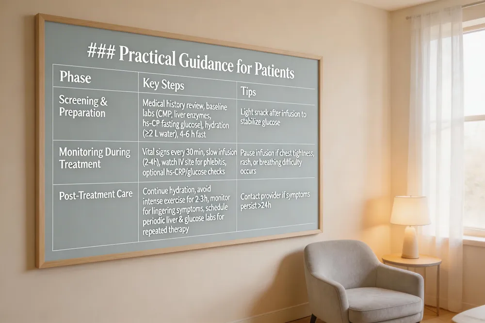 Screening and Preparation Before your first session, a qualified clinician will review your medical history, looking for allergies, liver or kidney disease, uncontrolled hypertension, or any prior reactions to IV therapies. Blood work may be ordered to check liver enzymes, hs‑CRP (inflammation marker), and basic metabolic panels, especially if you plan repeated or high‑dose infusions. Arrive well‑hydrated (2 L of water) and fast for 4–6 hours to reduce nausea and stomach discomfort. Some clinics also recommend a light snack after the infusion to stabilize blood sugar.
