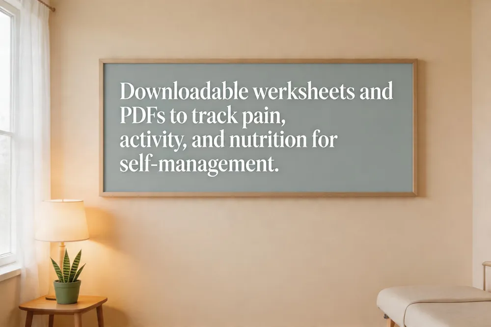 The PDF also offers practical self‑management worksheets—activity‑pacing charts, hydration logs, balanced‑nutrition checklists, and a simple rating wheel for tracking pain intensity and functional progress.