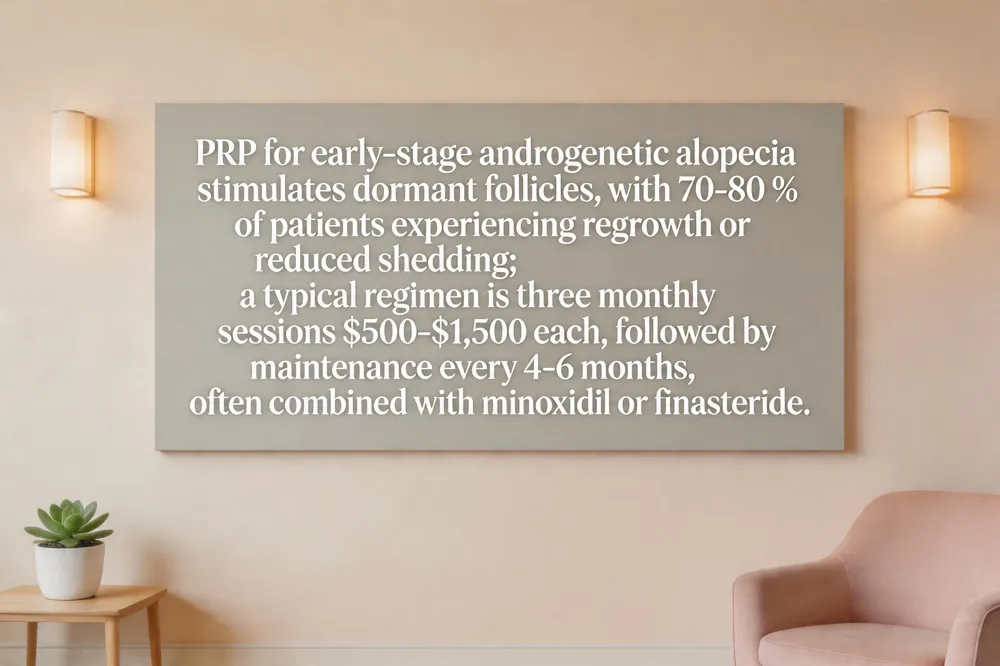 Platelet‑rich plasma (PRP) for hair loss begins with a small blood draw, centrifugation to concentrate platelets, and injection of the growth‑factor‑rich plasma into thinning scalp areas. The cocktail—especially VEGF, FGF and EGF—stimulates dormant follicles, prolongs the anagen phase, and can thicken shafts, making it most effective for early‑stage androgenetic alopecia. A typical regimen at Jana HealthCare includes three monthly sessions, followed by maintenance injections every 4‑6 months; results usually appear after three months and peak around one year. Clinical data show 70 %‑80 % of patients experience visible regrowth or reduced shedding, with patient‑reported satisfaction averaging 7.3 / 10. In New York, PRP hair restoration costs $500‑$1,500 per session, so a full series ranges $1,500‑$9,000, plus $500‑$1,000 for maintenance. Combining PRP with FDA‑approved therapies such as minoxidil or finasteride can enhance outcomes, offering a safe, minimally invasive option for both men and women seeking to restore hair density.