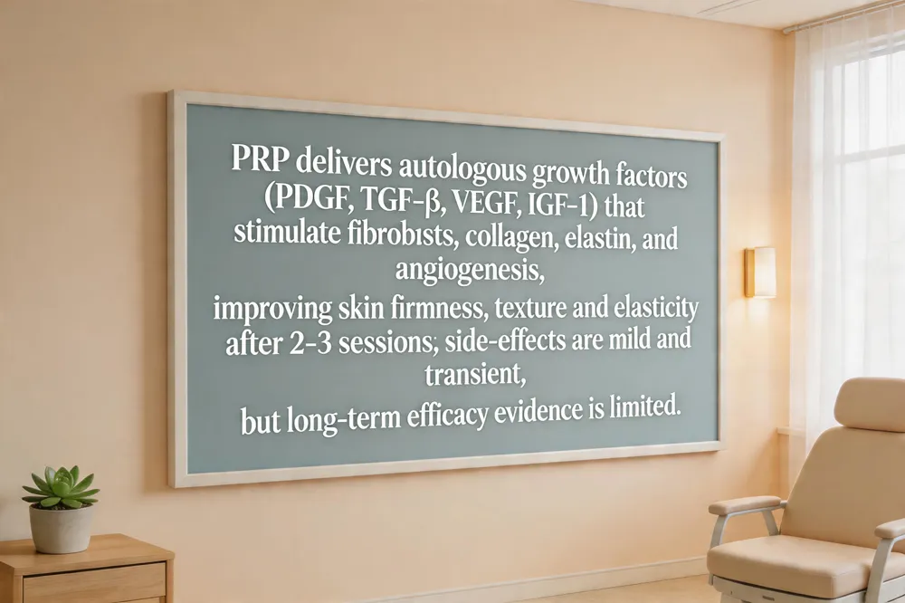 Platelet‑rich plasma (PRP) works by delivering a concentrated burst of autologous growth factors—PDGF, TGF‑β, VEGF, IGF‑1—that activate fibroblasts, stimulate new collagen and elastin, and promote angiogenesis, effectively jump‑starting tissue regeneration. A systematic review of 11 studies (≈382 patients) showed statistically significant increases in dermal collagen density and elastin after three PRP sessions spaced 2‑3 weeks, with objective gains in skin texture, firmness, and elasticity. Typical side‑effects are mild and transient—localized pain, bruising, swelling, or redness while rare complications such as infection, vascular occlusion, or nerve injury can occur if sterile technique or injection depth is compromised. Preparation protocols vary widely (single vs. double spin, centrifuge speed, leukocyte content), leading to inconsistent platelet counts and unpredictable outcomes. Downsides include limited high‑quality evidence for long‑term efficacy, the need for multiple sessions, high out‑of‑pocket cost, and lack of insurance coverage.