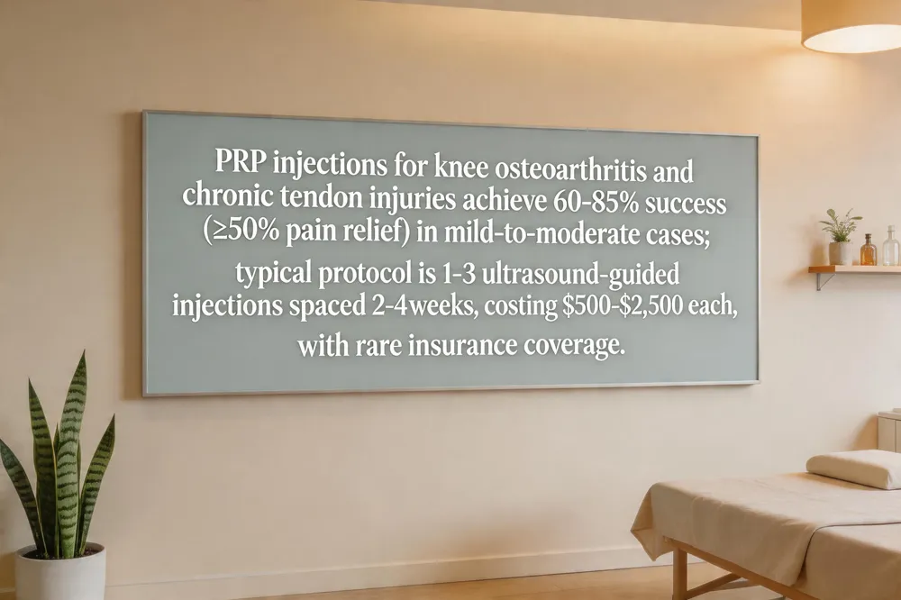 Platelet‑rich plasma (PRP) is a patient‑derived concentrate of platelets that releases PDGF, TGF‑β, VEGF and IGF‑1 to stimulate tissue repair. In orthopedics it is used for knee osteoarthritis (OA) and chronic tendon injuries such as tennis elbow, rotator‑cuff tendinopathy, and jumper’s knee. Systematic reviews and real‑world series report a 60‑85 % success rate—typically defined as ≥50 % pain and functional improvement—especially in mild‑to‑moderate OA (grades I‑III) and patients under 60. Most protocols involve one to three ultrasound‑guided injections spaced 2–4 weeks apart; each session costs $500‑$2,500 (average $800‑$1,200). Because PRP is classified as an investigational regenerative therapy, insurance rarely covers it; many practices accept cash, credit, HSA/FSA, and offer package discounts or financing. Contraindications include active infection, recent systemic steroids, anticoagulant therapy, cancer, uncontrolled diabetes, and platelet disorders. Patients should discuss a personalized treatment plan and cost estimate during the initial consultation.