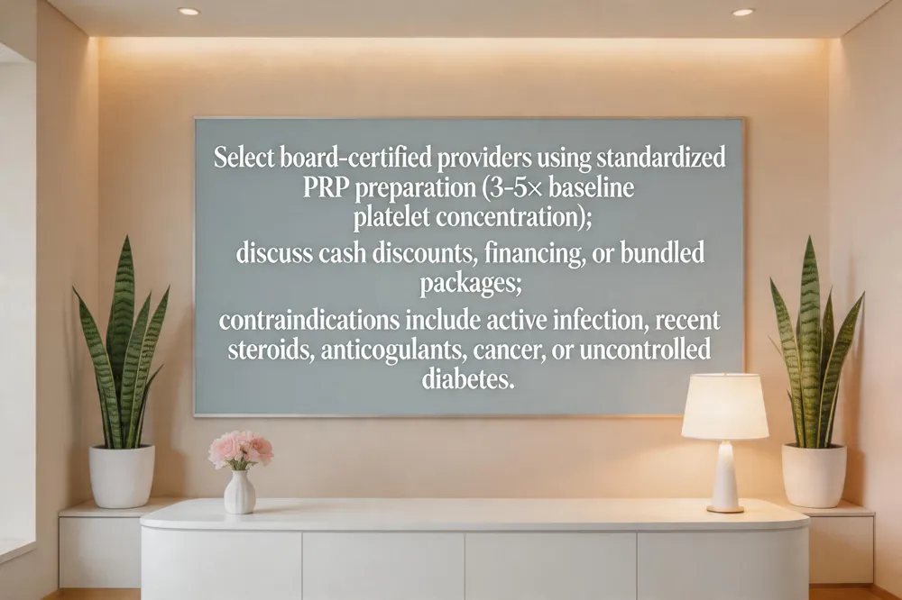 To locate a reputable PRP provider, start by checking board‑certified physicians, read patient reviews, and verify that the clinic follows standardized preparation protocols (single or double spin, platelet concentration 3‑5× baseline). During your first visit you’ll discuss goals, undergo a brief blood draw, and receive the PRP injection in the same session; most patients notice early improvement within weeks. Insurance rarely covers PRP, so ask about cash‑price discounts, financing plans, or bundled packages. Contraindications include active infection, recent steroids, anticoagulants, cancer, or uncontrolled diabetes; thorough screening ensures safety. Many practices, like Jana HealthCare in Brooklyn, integrate PRP with microneedling, laser resurfacing, and hyaluronic‑acid fillers for synergistic rejuvenation.