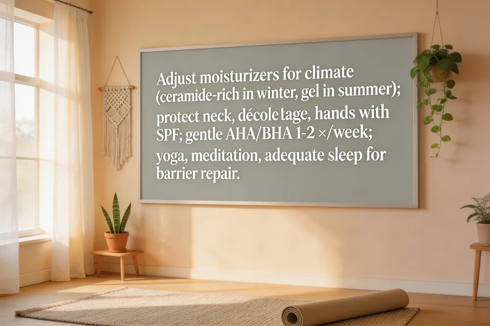 Changes in temperature, humidity, and UV intensity call for a flexible skincare strategy. In dry winter air, swap lightweight moisturizers for barrier‑repair creams rich in ceramides, hyaluronic acid, and glycerin to stop transepidermal water loss; in humid summer, opt for non‑comedogenic gels that keep oil in check while still delivering antioxidants like vitamin C. The neck, décolletage, and hands are thin, sun‑exposed surfaces that age first—apply a broad‑spectrum SPF 30+ sunscreen daily, follow with a peptide‑infused moisturizer, and consider gentle chemical exfoliation (AHA/BHA 1–2×/week) to maintain radiance. Mind‑body practices such as yoga, meditation, and regular aerobic exercise improve circulation and reduce oxidative stress, amplifying the benefits of topical antioxidants. Prioritizing stress reduction and sleep hygiene—7–9 hours of restorative sleep, screen‑free wind‑down routines, and stress‑management techniques—supports the skin’s nightly repair cycle, helps collagen synthesis, and minimizes cortisol‑driven inflammation. Together, these seasonal and holistic habits reinforce the skin’s barrier, protect against UV‑induced damage, and promote a calm, youthful complexion at any age.