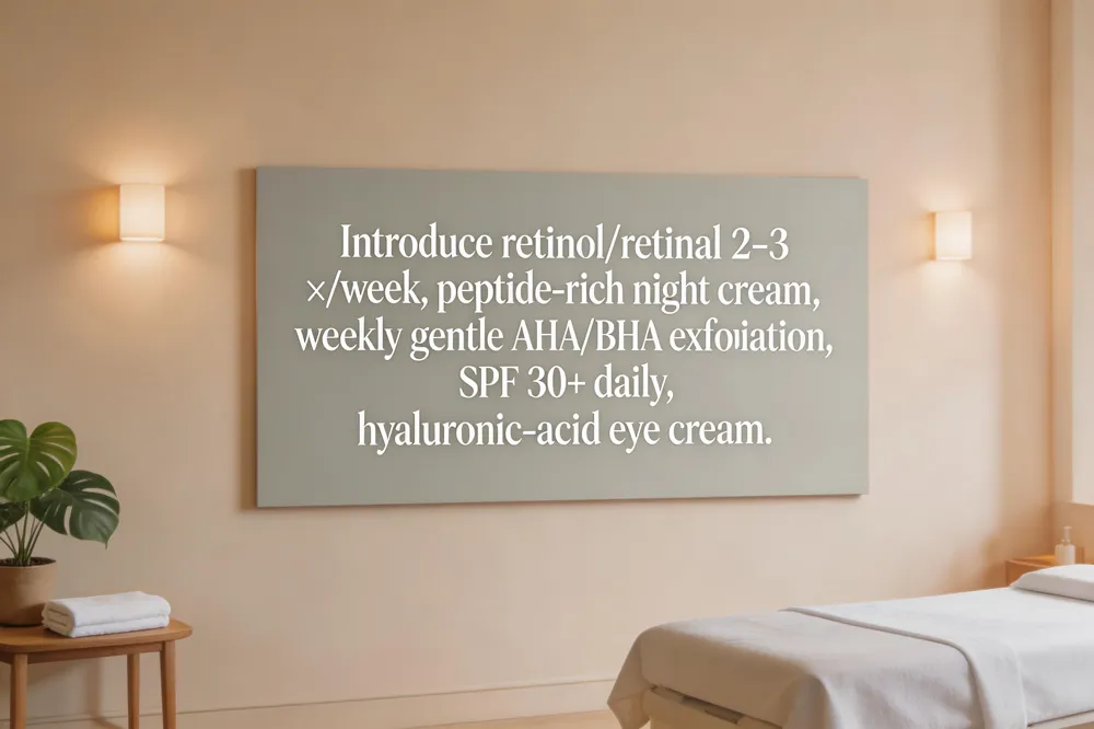 What should a 40‑year‑old skin care routine look like?: Cleanse, antioxidant vitamin C, hyaluronic‑acid peptide moisturizer, SPF in the morning; retinol 2‑3 times weekly, barrier‑repair moisturizer at night; weekly gentle chemical exfoliation.