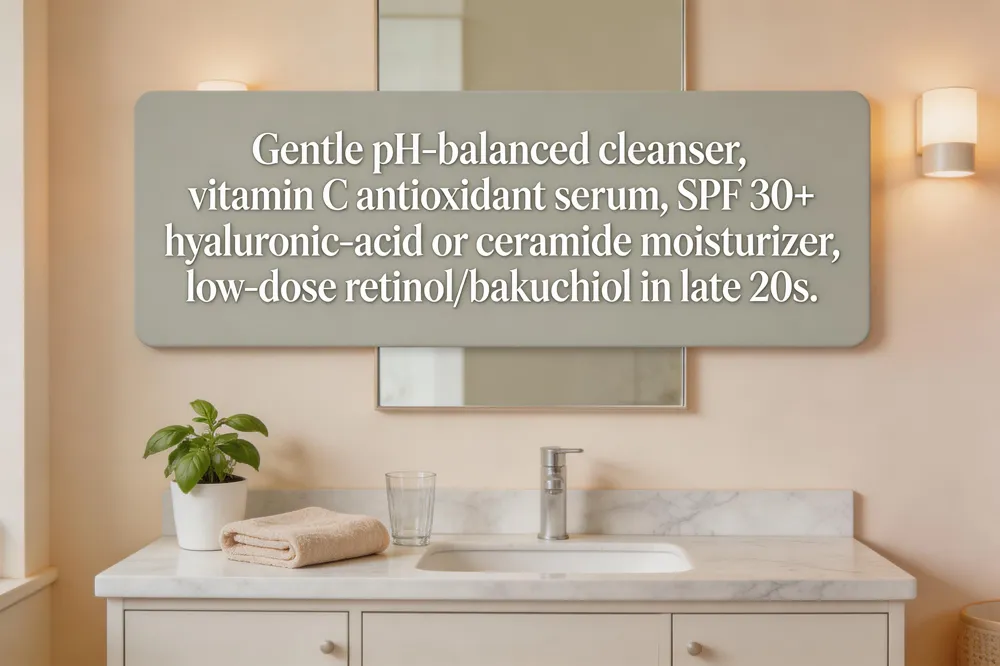 25‑year‑old routine: gentle cleanser, vitamin C serum AM, hyaluronic‑acid serum PM, broad‑spectrum SPF 30+ sunscreen, mild AHA/BHA 2‑3×/week, occasional low‑dose retinol or peptide night cream.