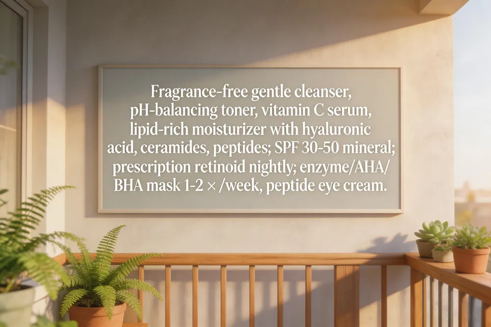 A 50‑year‑old skin‑care routine should start with a gentle, fragrance‑free cleanser and a pH‑balancing toner to protect the thinning barrier. In the morning, apply a vitamin C antioxidant serum then a rich, lipid‑rich moisturizer that blends hyaluronic acid, ceramides, and peptides to lock in moisture and stimulate collagen. Finish with broad‑spectrum SPF 30‑50 (mineral filters preferred) and a targeted eye cream containing peptides or caffeine for crow’s feet and dark circles. At night, use a prescription‑strength retinoid or high‑potency retinol to boost cell turnover and improve texture, followed by the same peptide‑infused cream for barrier repair. Gentle exfoliation—once or twice weekly with an enzyme or low‑percentage AHA/BHA mask—keeps cells fresh without stripping. Natural maintenance includes staying hydrated, eating antioxidant‑rich foods, getting 7‑9 hours sleep, and managing stress. This balanced approach, supported by dermatologists can visibly improve texture, firmness and radiance even after 50.