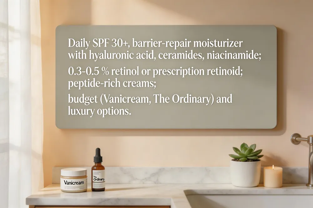 Best skin care routine for 40s on a budget: Vanicream or CeraVe cleanser → The Ordinary Vitamin C → hyaluronic serum → breathable SPF moisturizer → night retinol (0.2 %) → same barrier‑repair moisturizer.