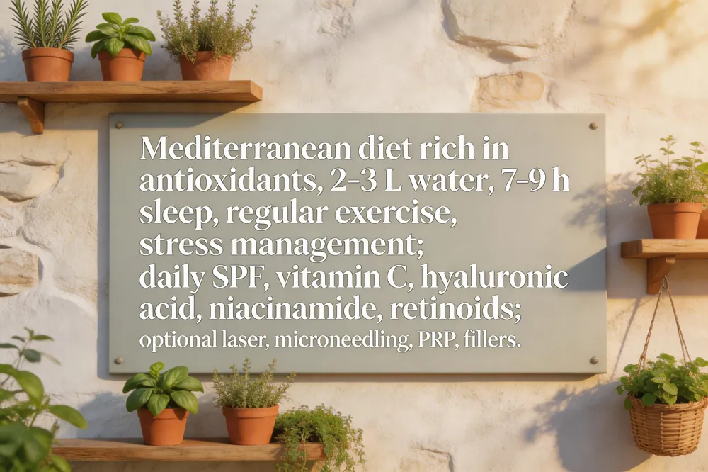 A Mediterranean‑style diet rich in berries, leafy greens, nuts and olive oil supplies antioxidants (vitamin C, polyphenols, pterostilbene) that protect skin from free‑radical damage and boost collagen. Combine this with 2‑3 L of water daily and 7‑9 hours of sleep in a cool, dark room to keep the barrier hydrated and allow overnight repair. Regular aerobic exercise, strength training and yoga improve circulation, muscle tone and posture, while mindfulness or breathing techniques lower cortisol‑driven inflammation. Skincare should focus on proven actives: vitamin C serums for brightening, hyaluronic acid for plumping, niacinamide and ceramides for barrier repair, and retinoids (retinol or prescription‑strength) to stimulate collagen and cell turnover. Non‑surgical aesthetic options—laser resurfacing, microneedling PRP therapy and hyaluronic acid fillers—further smooth fine lines and restore volume without surgery.