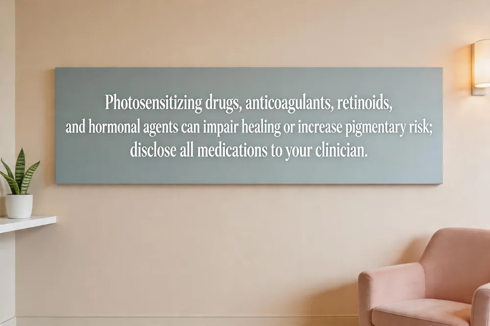 What drugs affect laser hair removal? Certain medications make the skin more photosensitive or impair healing, raising the chance of burns, pigment changes, or bruising. These include tetracycline antibiotics, fluoroquinolones, oral isotretinoin and other retinoids, topical acne agents (benzoyl peroxide), some antidepressants and antihistamines, and blood‑thinners (aspirin, warfarin, clopidogrel). Immunosuppressants and high‑dose vitamin A supplements also increase risk. Disclose all prescription and over‑the‑counter drugs to your clinician so appropriate waiting periods—often six months for isotretinoin and a few weeks for antibiotics—can be observed before scheduling laser hair removal.