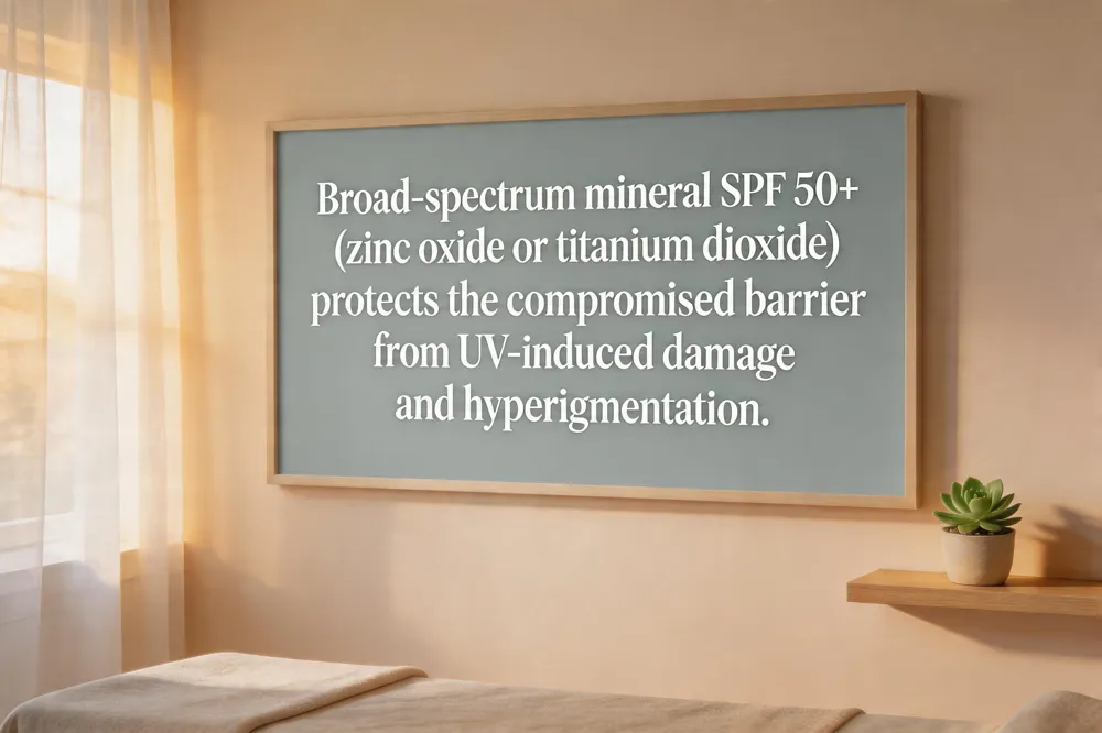 Stick to gentle, fragrance‑free moisturizers with ceramides, hyaluronic acid, or panthenol, and apply a broad‑spectrum mineral sunscreen (zinc oxide or titanium dioxide, SPF 50+). Avoid all actives listed above until the clinician confirms the skin has fully resurfaced.