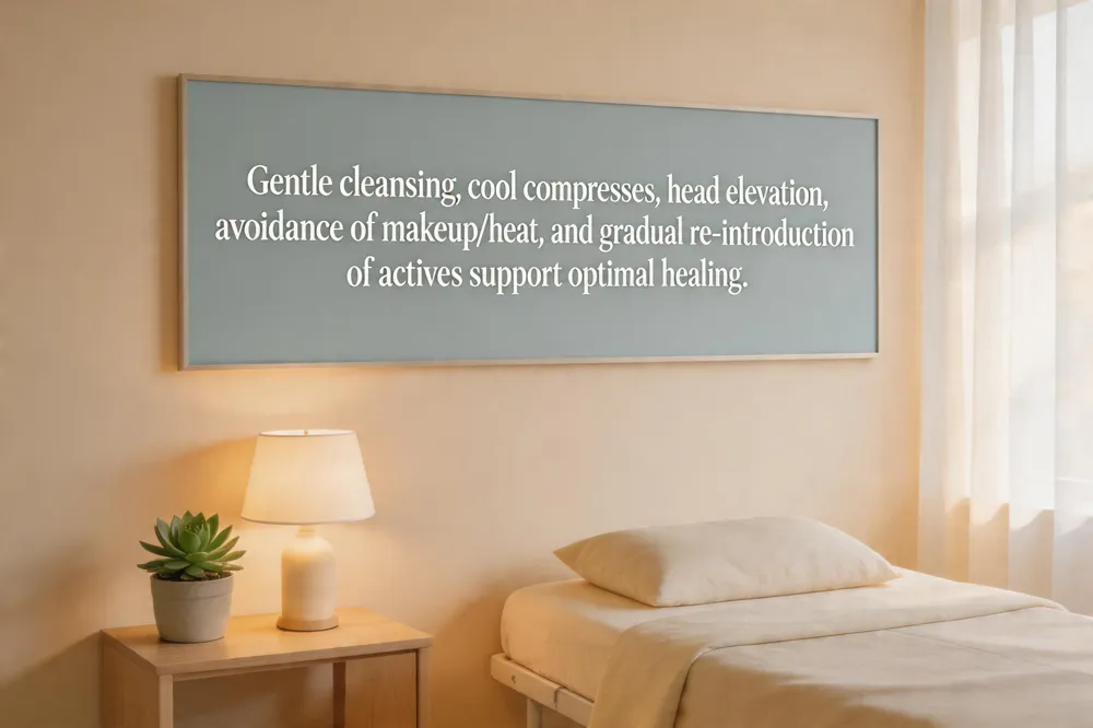 Begin with a cool compress for a few minutes to reduce inflammation, then cleanse gently with a fragrance‑free , sulfate‑free cleanser 2‑5 times daily. Keep the area hydrated using a Barrier‑repair moisturizer containing ceramides, hyaluronic acid, or aloe vera. Avoid picking, scratching, and any active exfoliants (retinoids, AHAs, BHAs) for at least one week, or longer if your clinician advises. Stay well‑hydrated, get ample rest, and follow your provider’s personalized after‑care plan for the quickest, safest recovery.