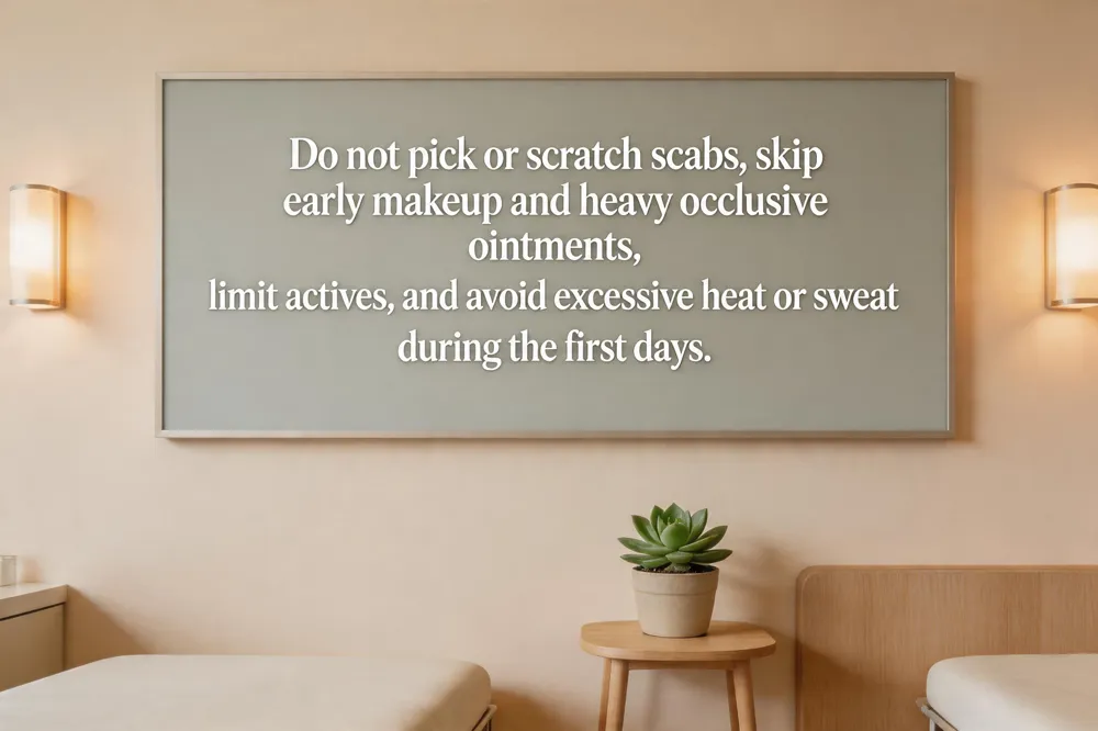 Avoiding makeup, picking, and heat exposure – Do not apply makeup, sunscreen with chemical filters, or any abrasive exfoliants for at least 48‑72 hours. Refrain from touching or picking at scabs, and keep the skin away from hot showers, saunas, and intense exercise for the first 24‑48 hours.