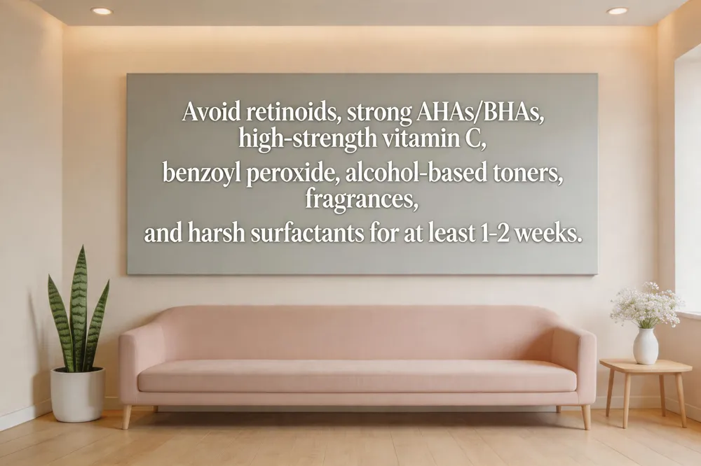 After a laser procedure the skin’s barrier is temporarily compromised, so any ingredient that can irritate, increase cell turnover, or strip moisture should be avoided.