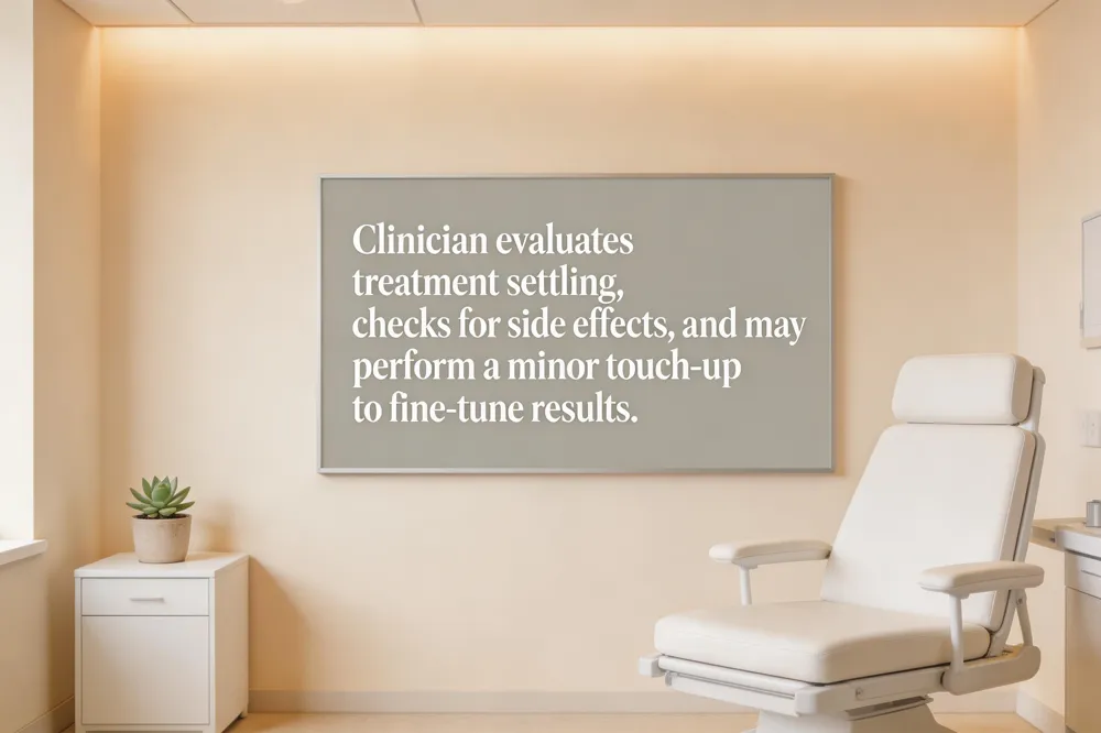 When to follow‑up: A follow‑up appointment 2–3 weeks after injection allows the provider to assess full results and correct any imperfections, such as residual wrinkles or eyebrow asymmetry. At this visit the provider checks for symmetry, residual lines or rare side‑effects (e.g., mild ptosis) and can add a few units if needed. A touch‑up at this stage ensures the desired aesthetic is locked in before the effect begins to fade.