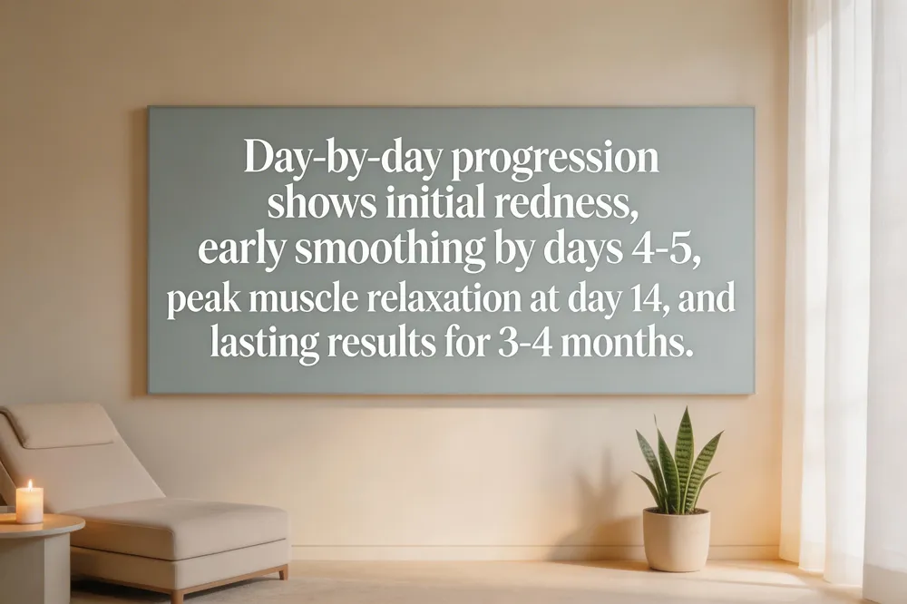 Days‑2‑3: Redness fades; a subtle tightness may be felt as the toxin binds to nerve endings. No visible wrinkle reduction yet.