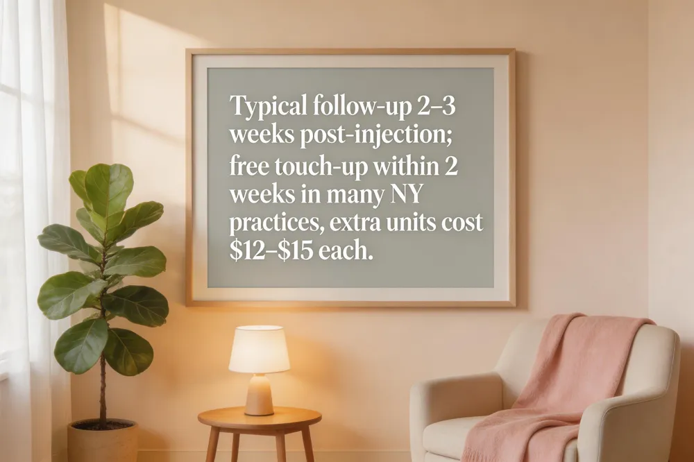 Pricing per unit and free‑touch‑up guarantees – Many practices, especially in New York, offer a complimentary touch‑up within the two‑week window if the original dose was insufficient. If additional units are needed, the cost usually ranges from $12 to $15 per unit. A small correction of 5–10 units therefore costs roughly $60‑$150. Some clinics bundle the touch‑up into a “first‑treatment” package, so it’s best to confirm the policy during the initial consultation.