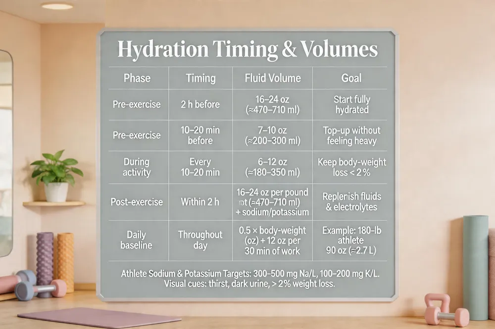 | Post‑exercise | Within 2 h | 16–24 oz per pound lost (≈470–710 ml) + sodium/potassium | Replenish fluids & electrolytes |