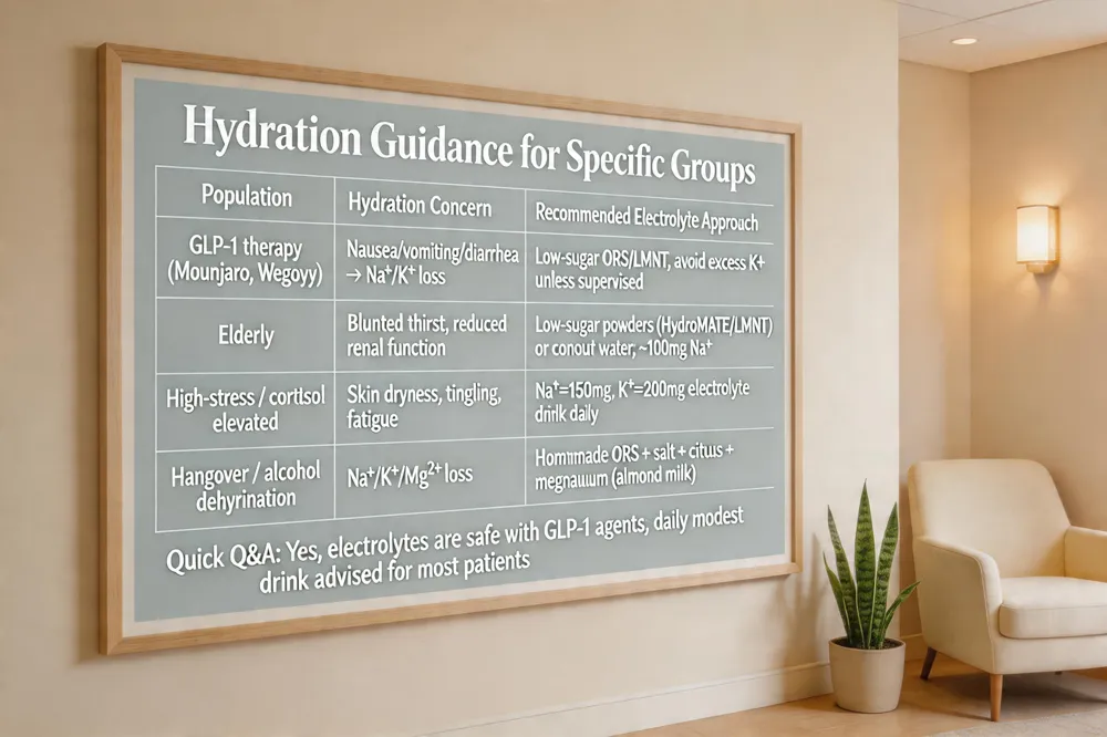 | GLP‑1 therapy patients (Mounjaro, Wegovy) | Nausea, vomiting, diarrhea → increased Na⁺/K⁺ loss | Low‑sugar ORS or powder (e.g., LMNT); avoid excess potassium unless supervised |