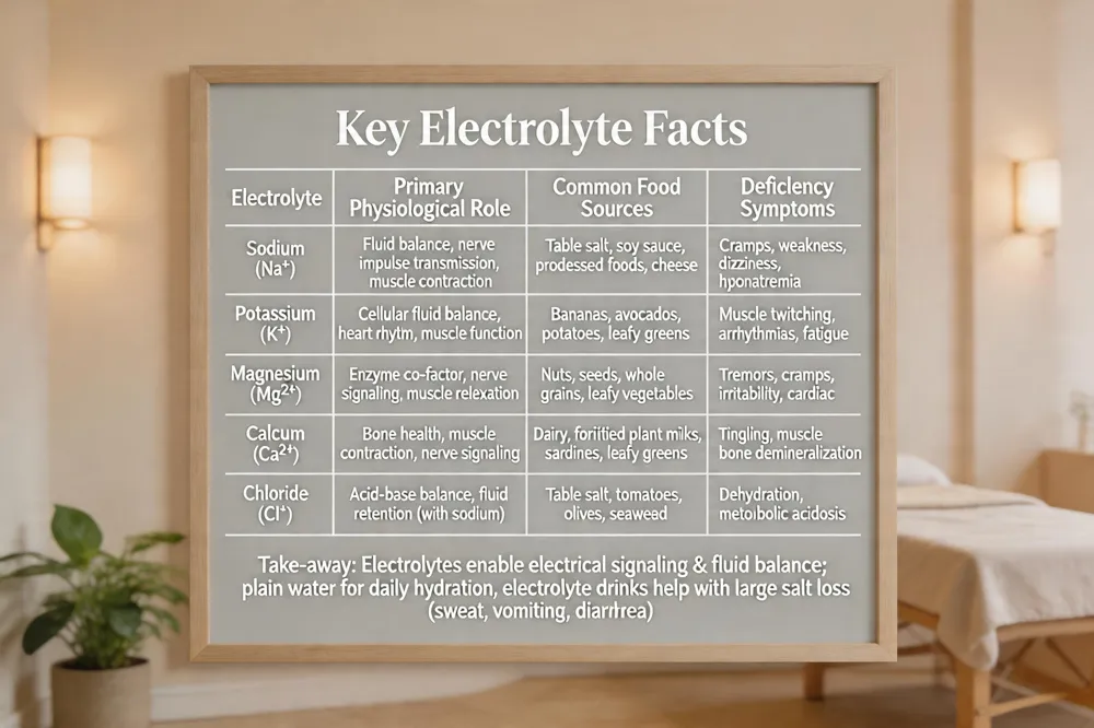 | Quick home rehydration | 1 L water + 1/8 tsp sea salt + lime juice (+ optional coconut water) | Na⁺, K⁺, Mg²⁺, Ca²⁺ |