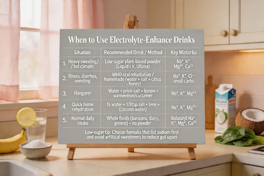 Low‑sugar tip: Choose formulas that list sodium first and avoid artificial sweeteners to reduce gut upset.