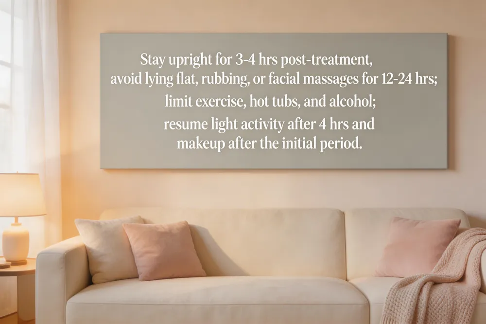 If you accidentally lay down soon after treatment, stay calm: keep upright for the next few hours, avoid pressure on the areas, and resume normal activities after the four‑hour mark. Monitor for unusual swelling or drooping and contact your provider if needed.