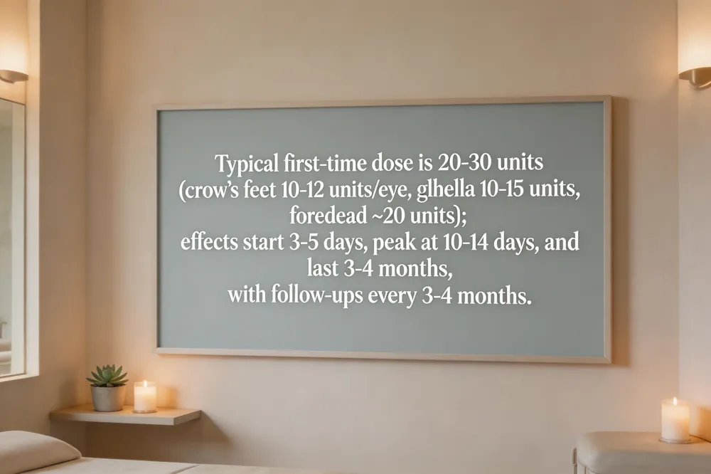 For a first‑time Botox session the usual dose is 20‑30 units total. Crow’s feet often need 10‑12 units per eye, the glabella (frown lines) about 10‑15 units, and the forehead roughly 20 units. The exact number varies with muscle strength, gender, and expressive habits.
