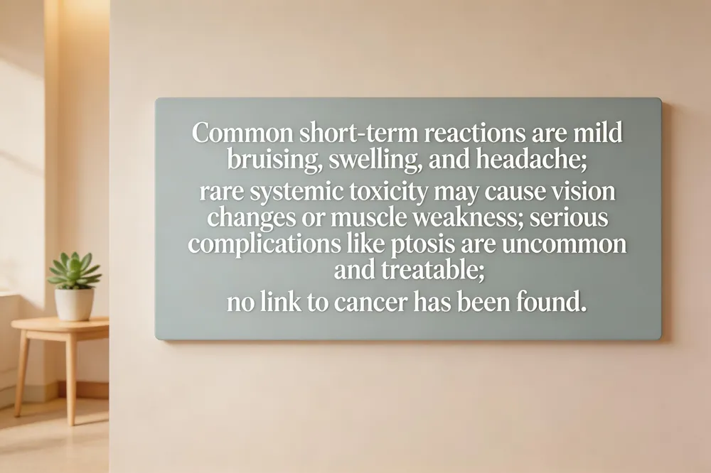 Serious but rare complications: While most adverse events are temporary, unusual complications such as upper‑eyelid ptosis, ectropion, or the “Mephisto sign” (raised lateral eyebrows) may appear. These are usually self‑limited and can be corrected with follow‑up injections or eye drops.